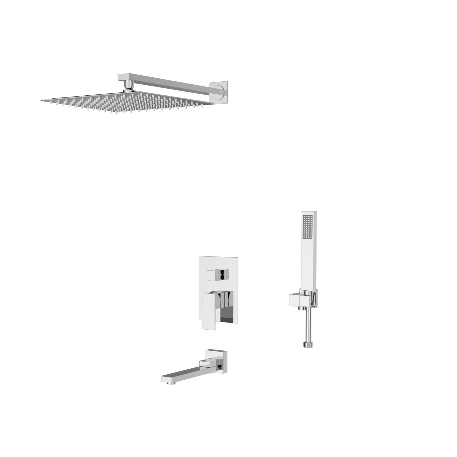 - Смеситель, встраиваемая часть: блок, излив, держатель ручного душа, ручная лейка, держатель верхнего душа, тропический верхний душ, душевой шланг, паспорт, брендовая сумка
